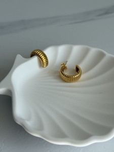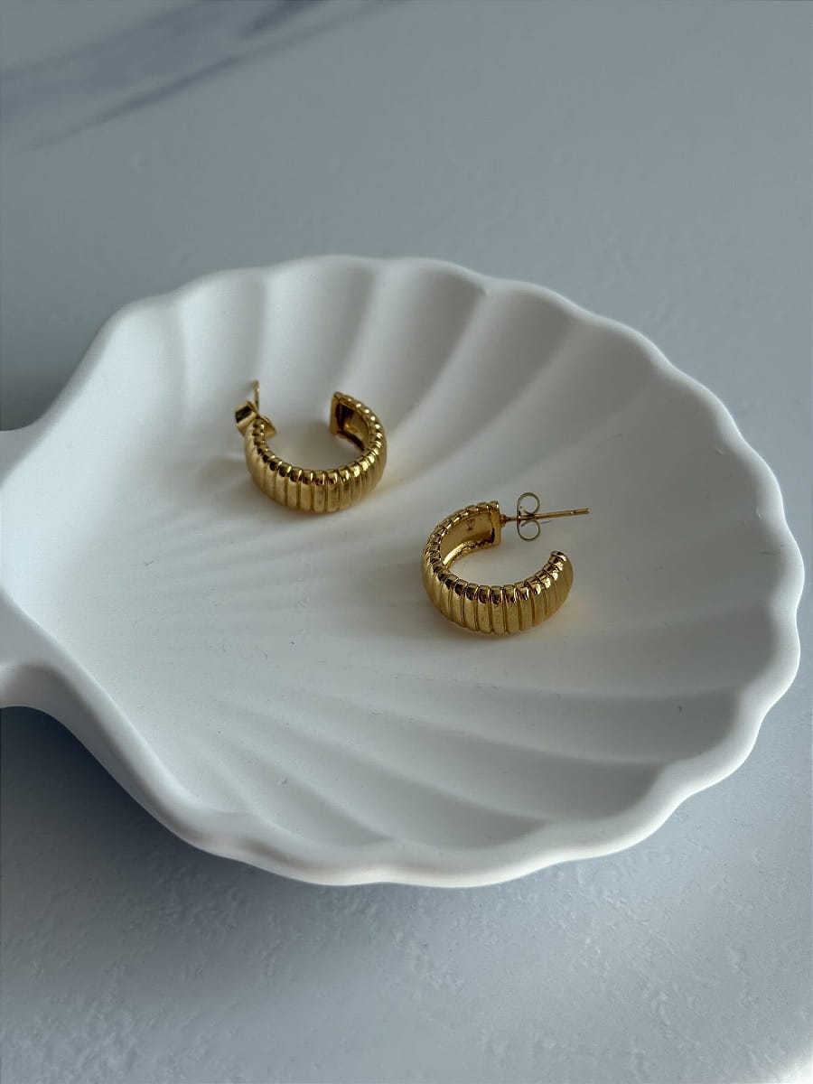 Złote kolczyki z ozdobnymi wydrążeniami.