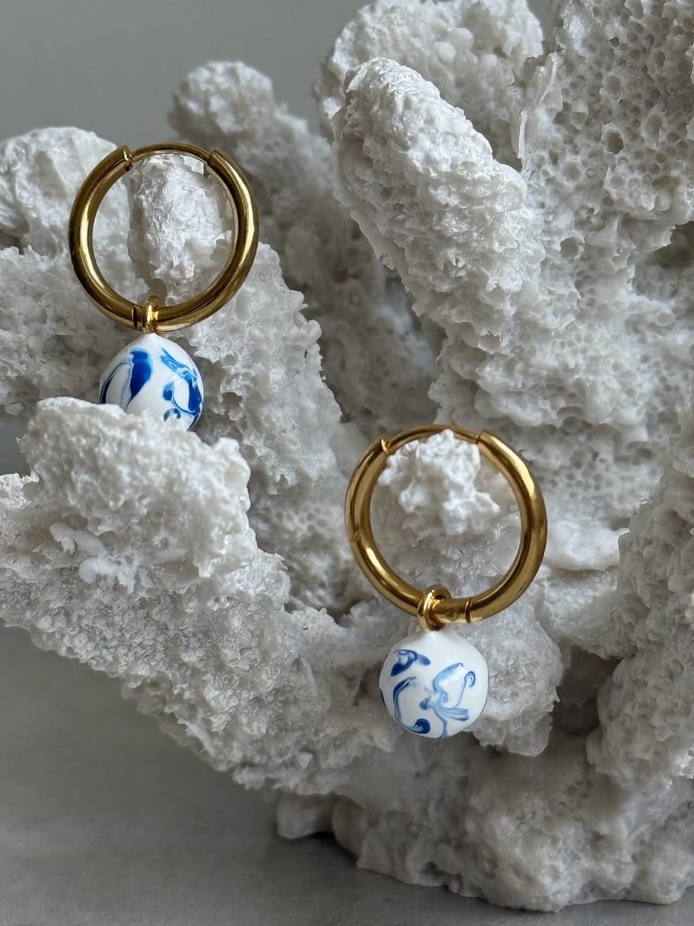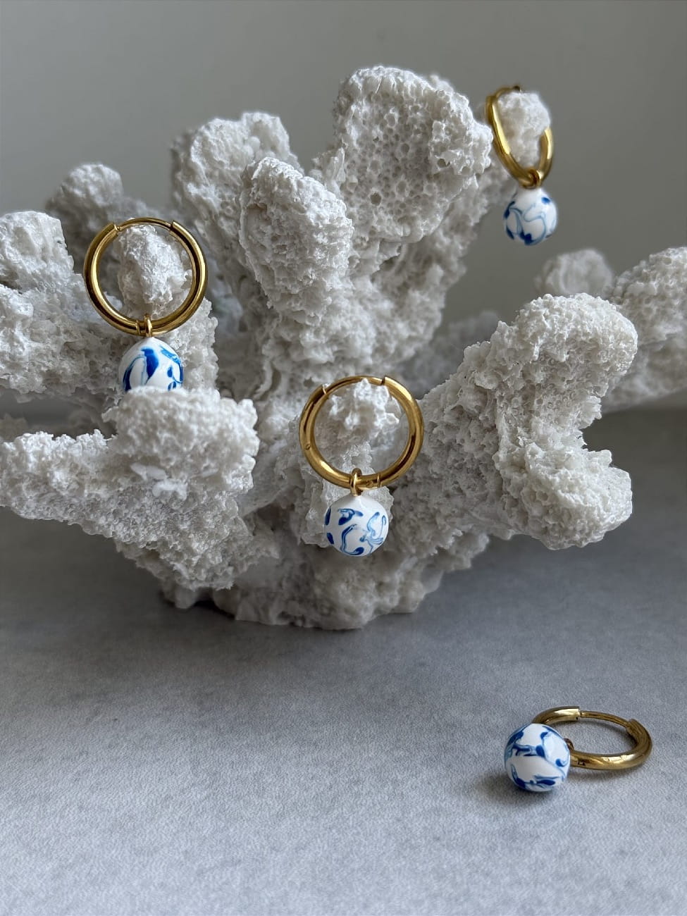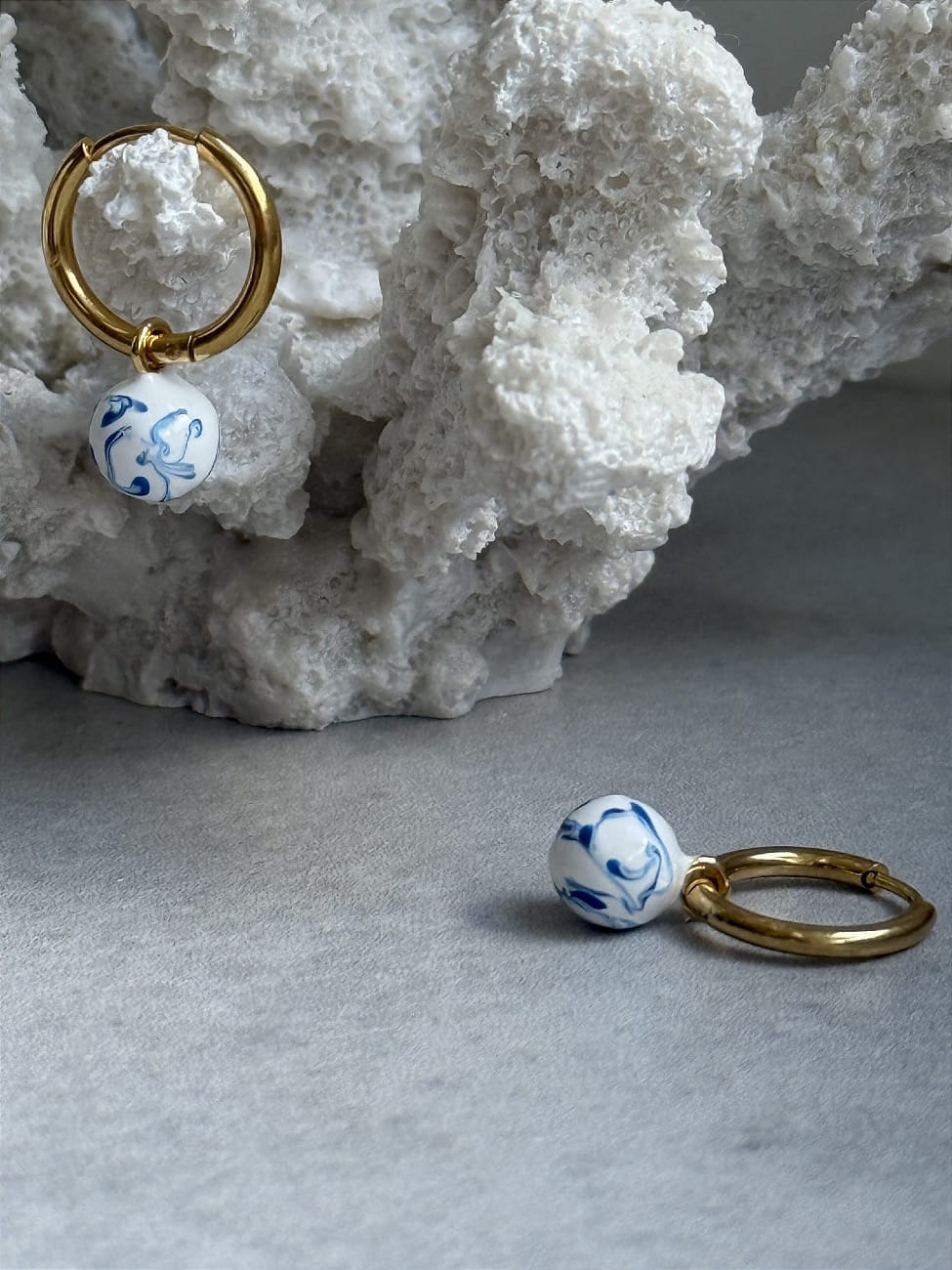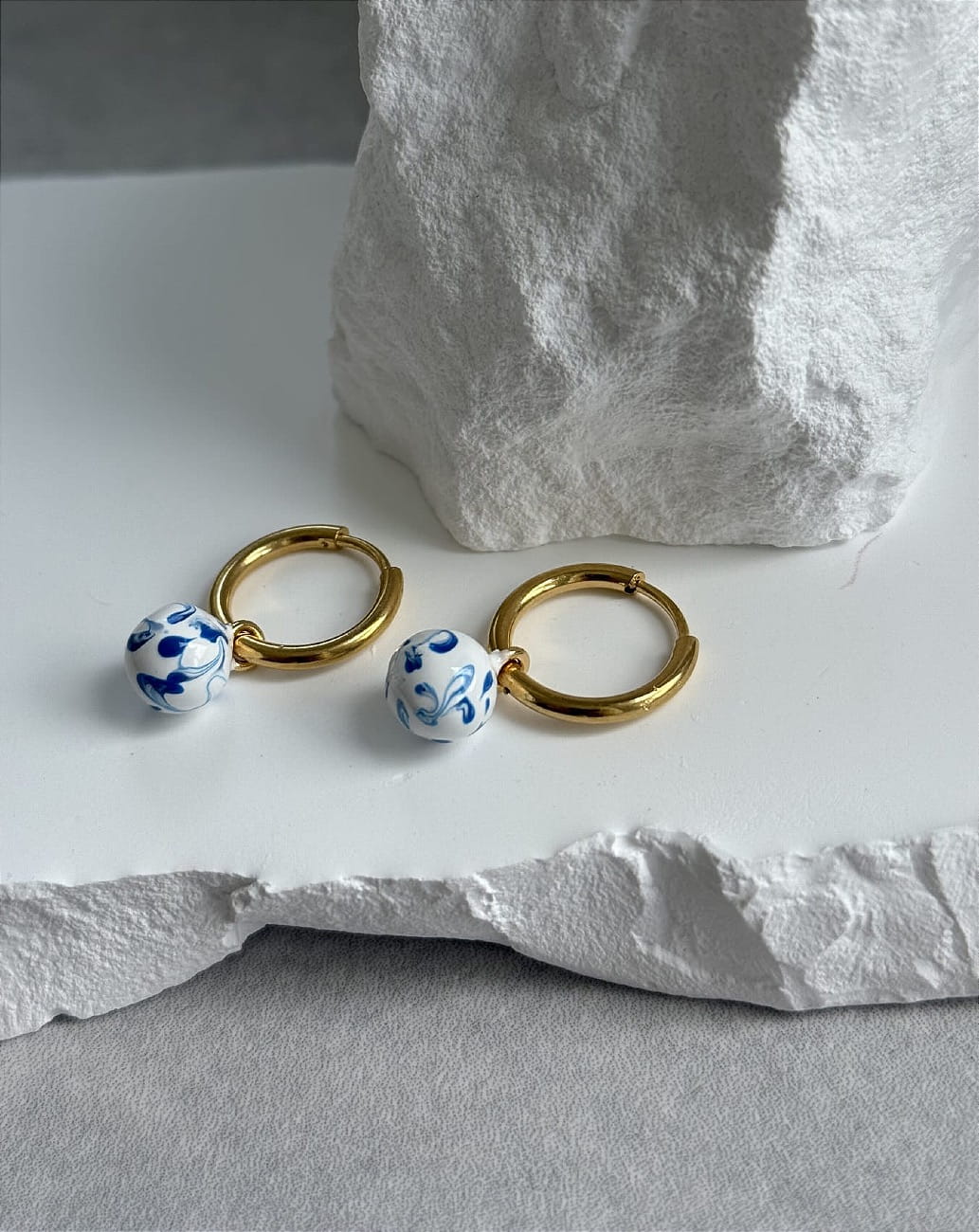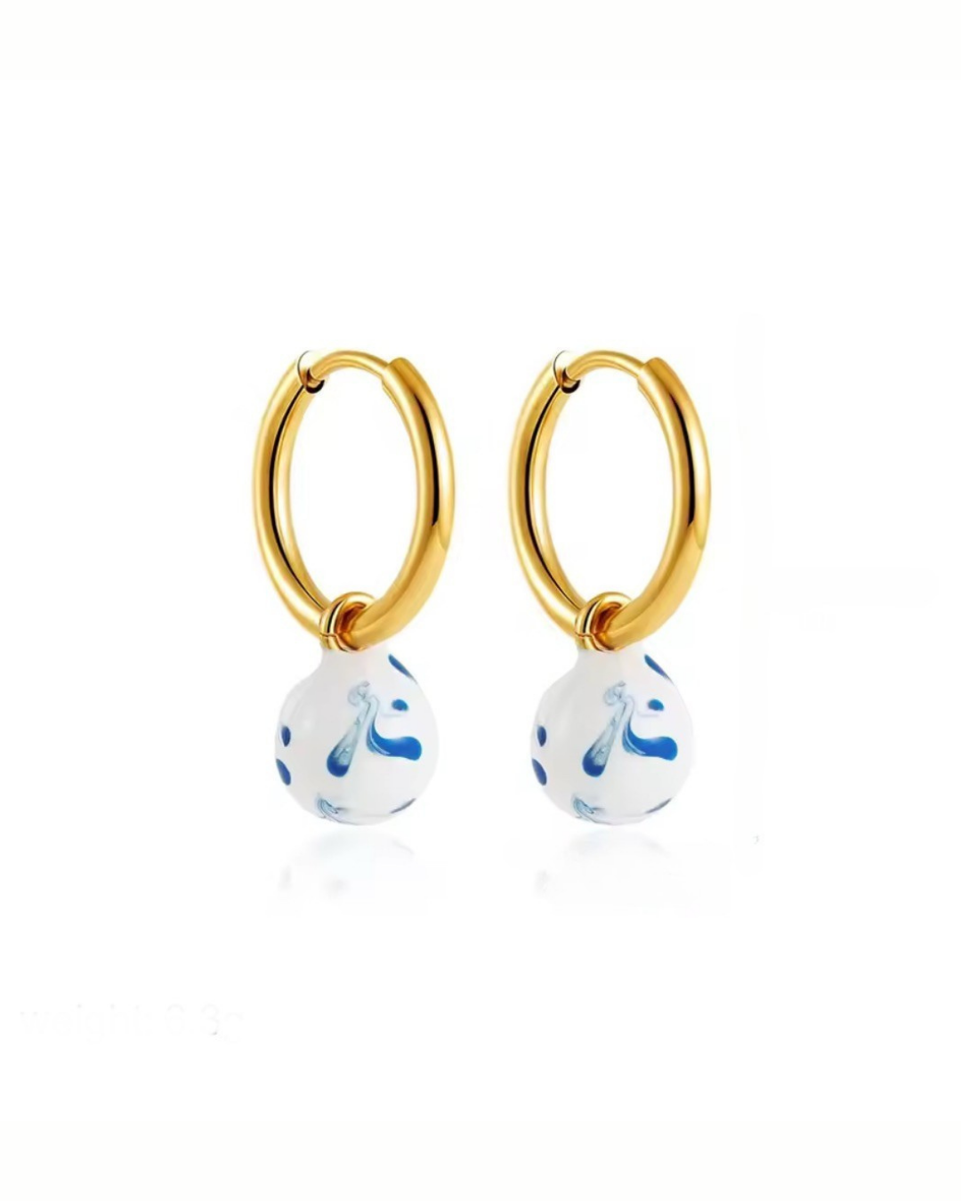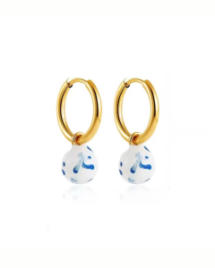 Klasyczne pozłacane kółka z zawieszką - kulką. Malowane na biało z niebieskimi muśnięciami.