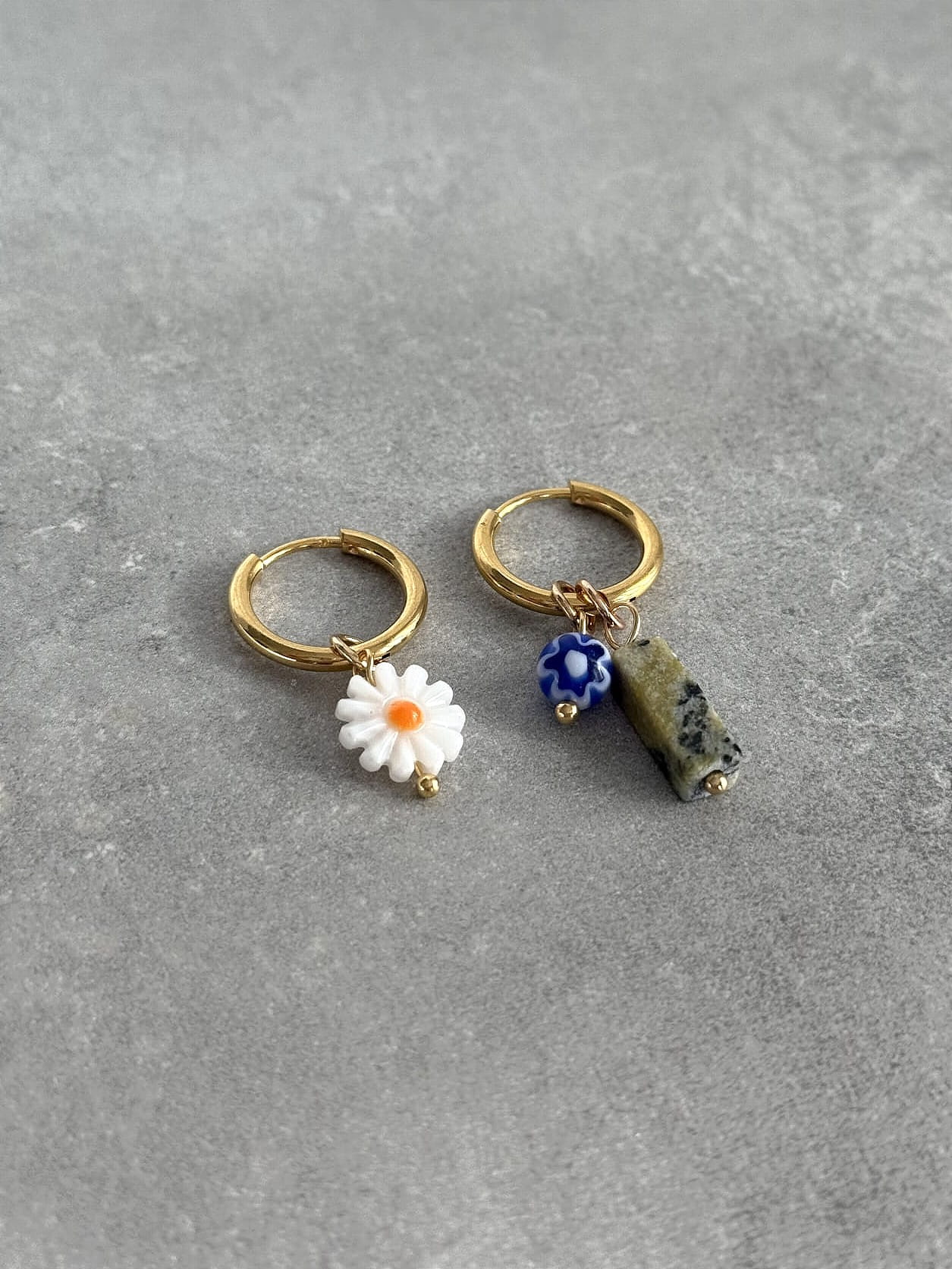 Stokrotka, niebieska kulka z żywicy i podłużny kamień naturalny