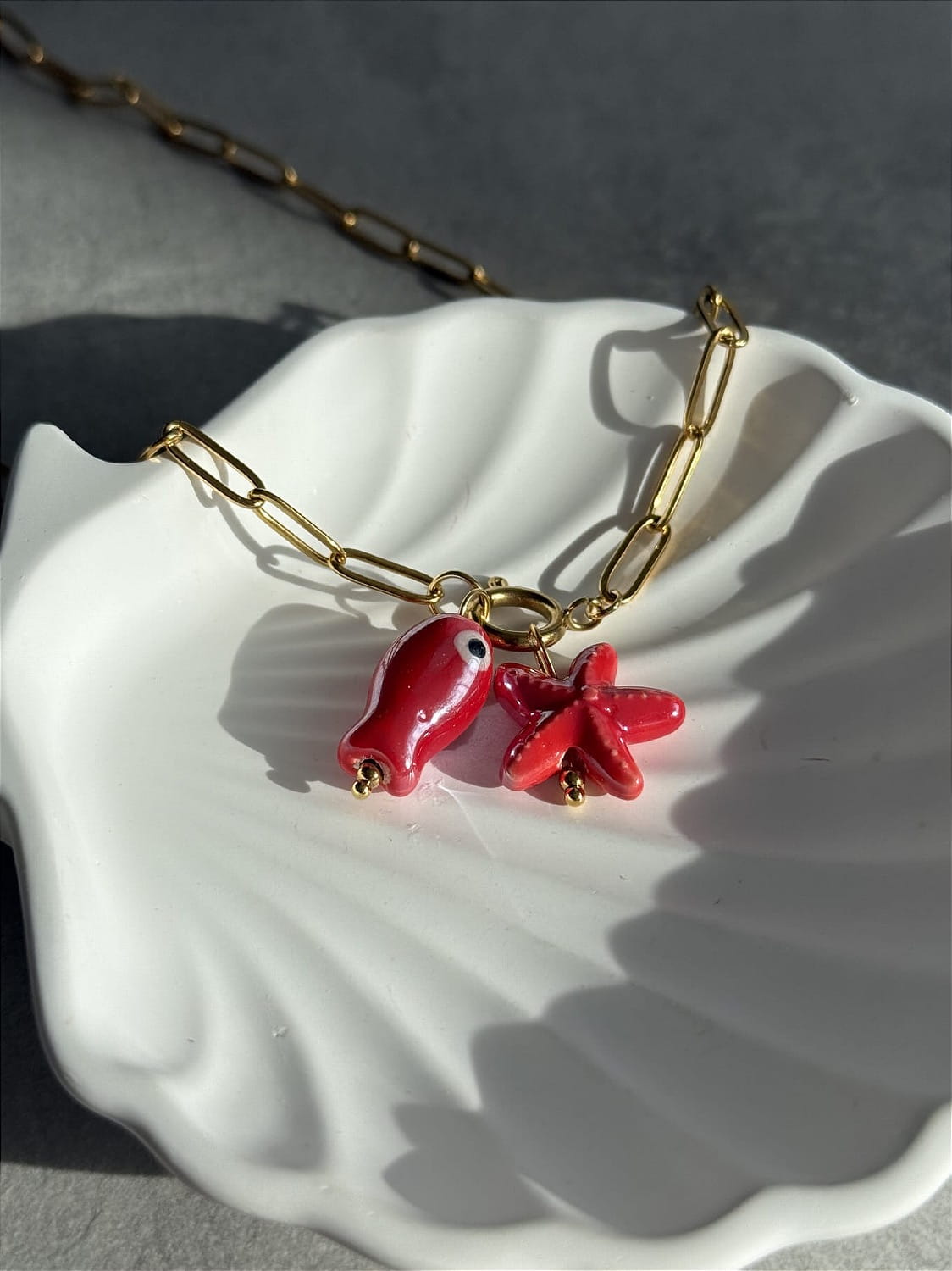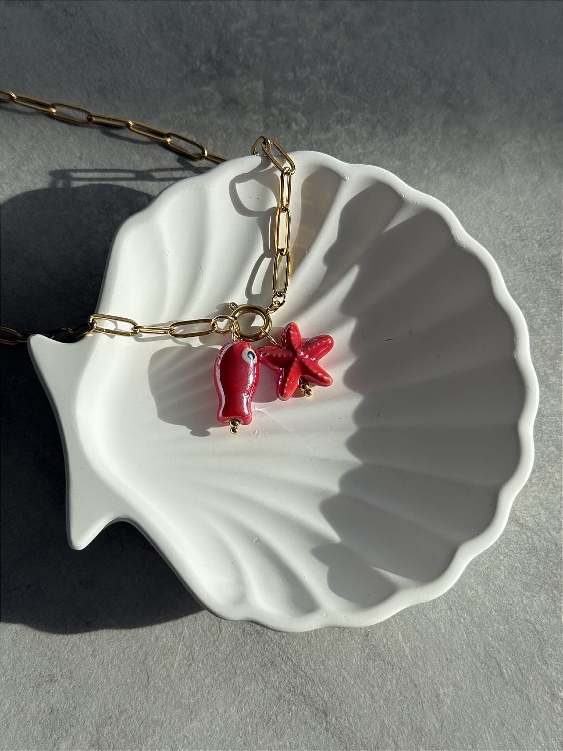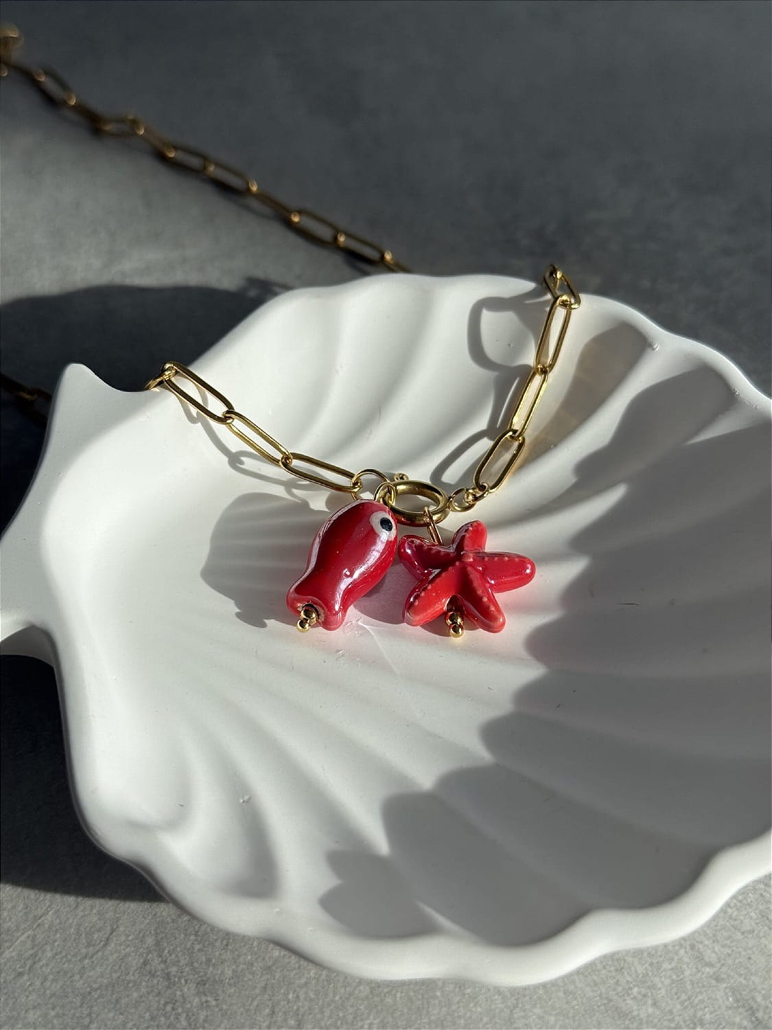 Złoty łańcuszek wykonany z pozłacanej stali szlachetnej, który zdobi zawieszka w kształcie rybki i rozgwiazdy