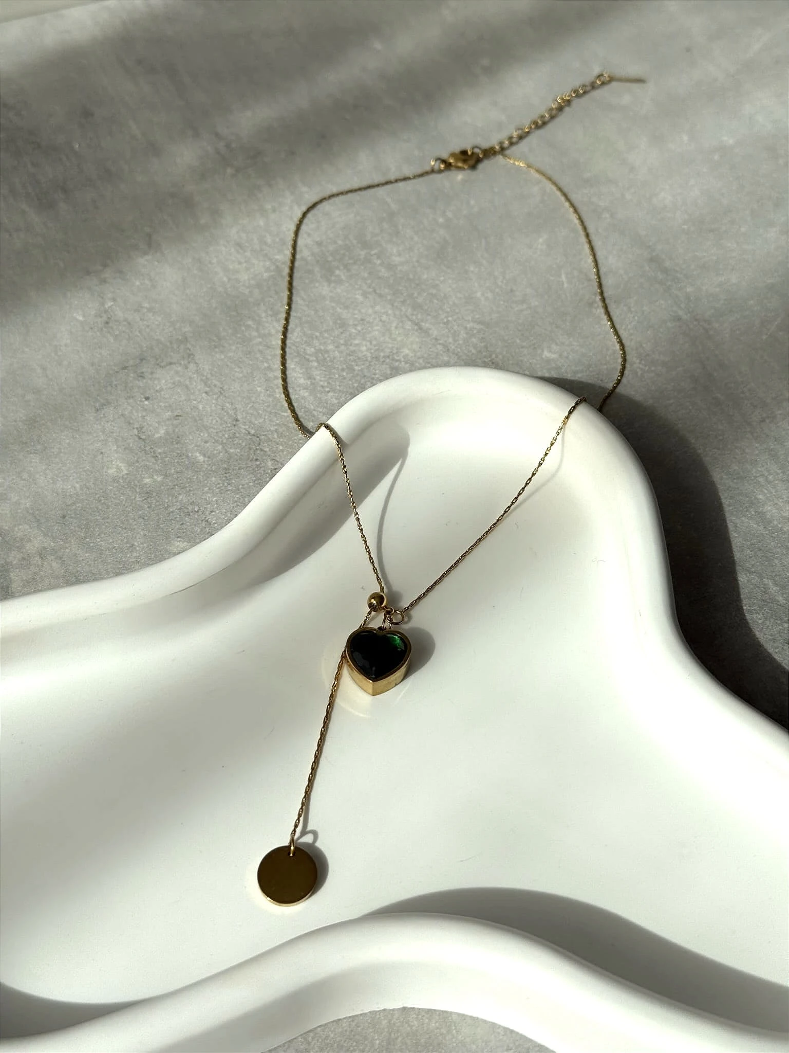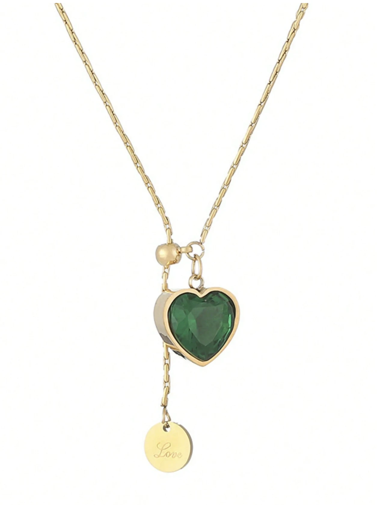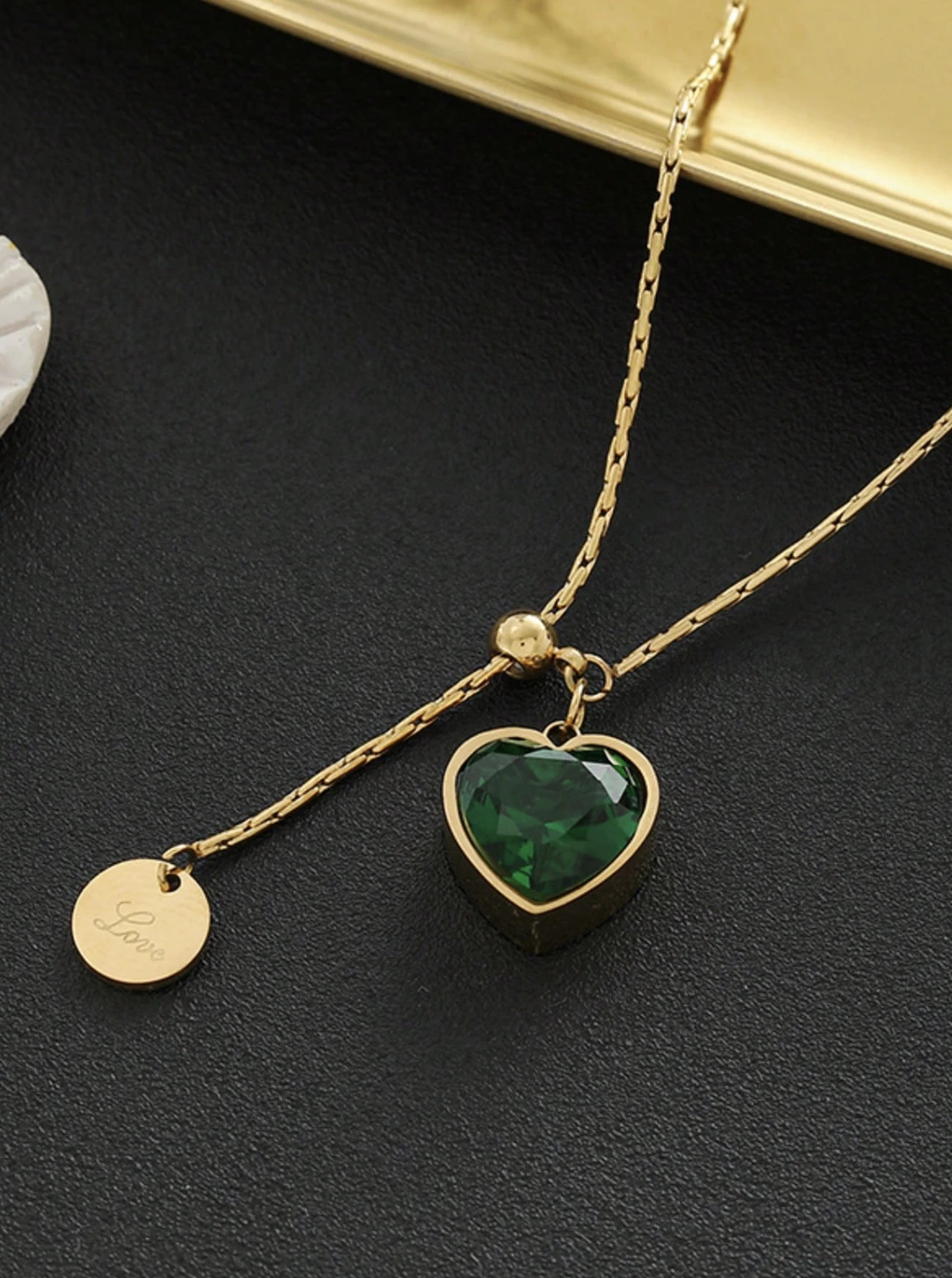 Okrągła blaszka z napisem "LOVE" i serduszko z zielonym kamieniem