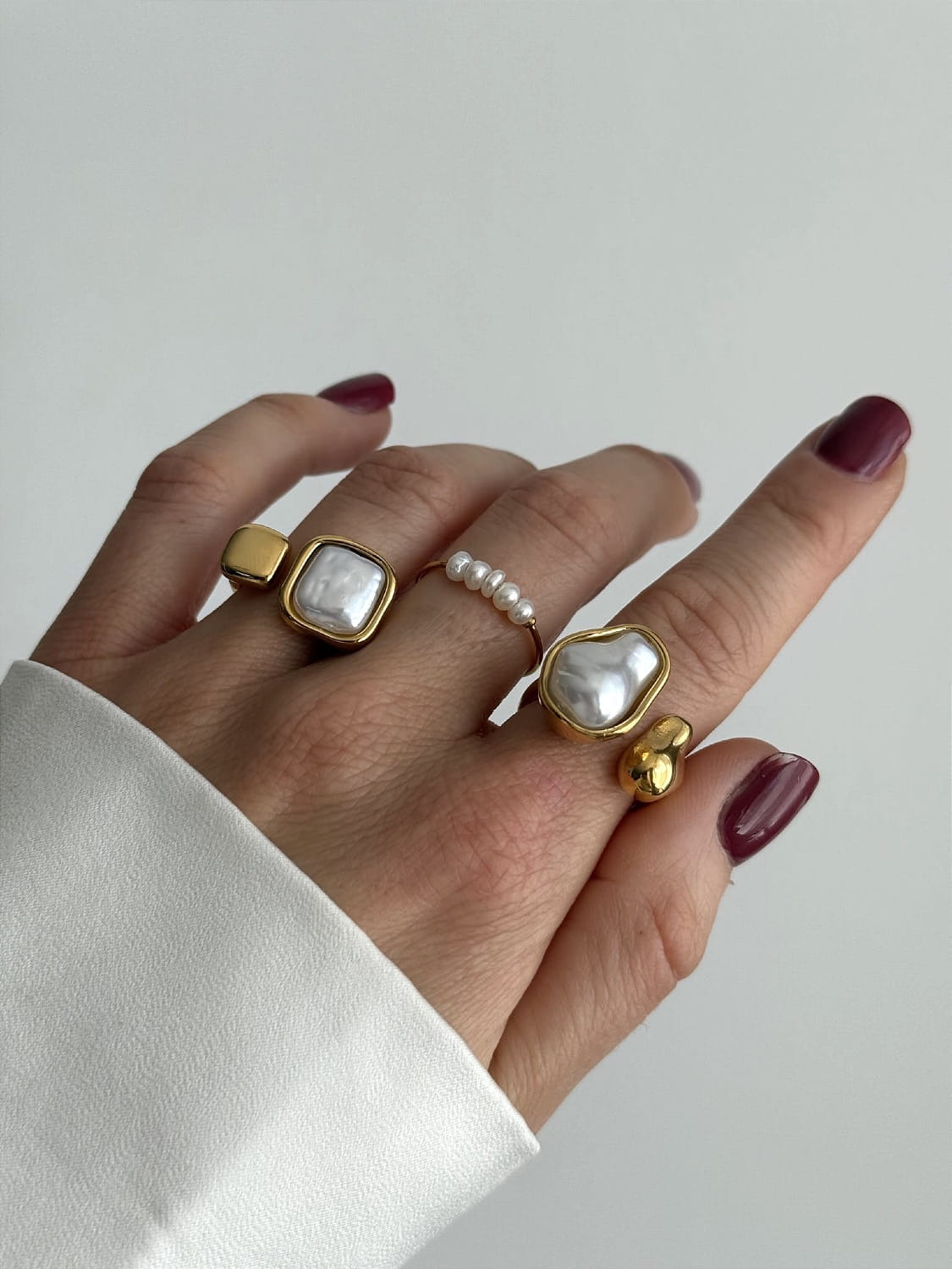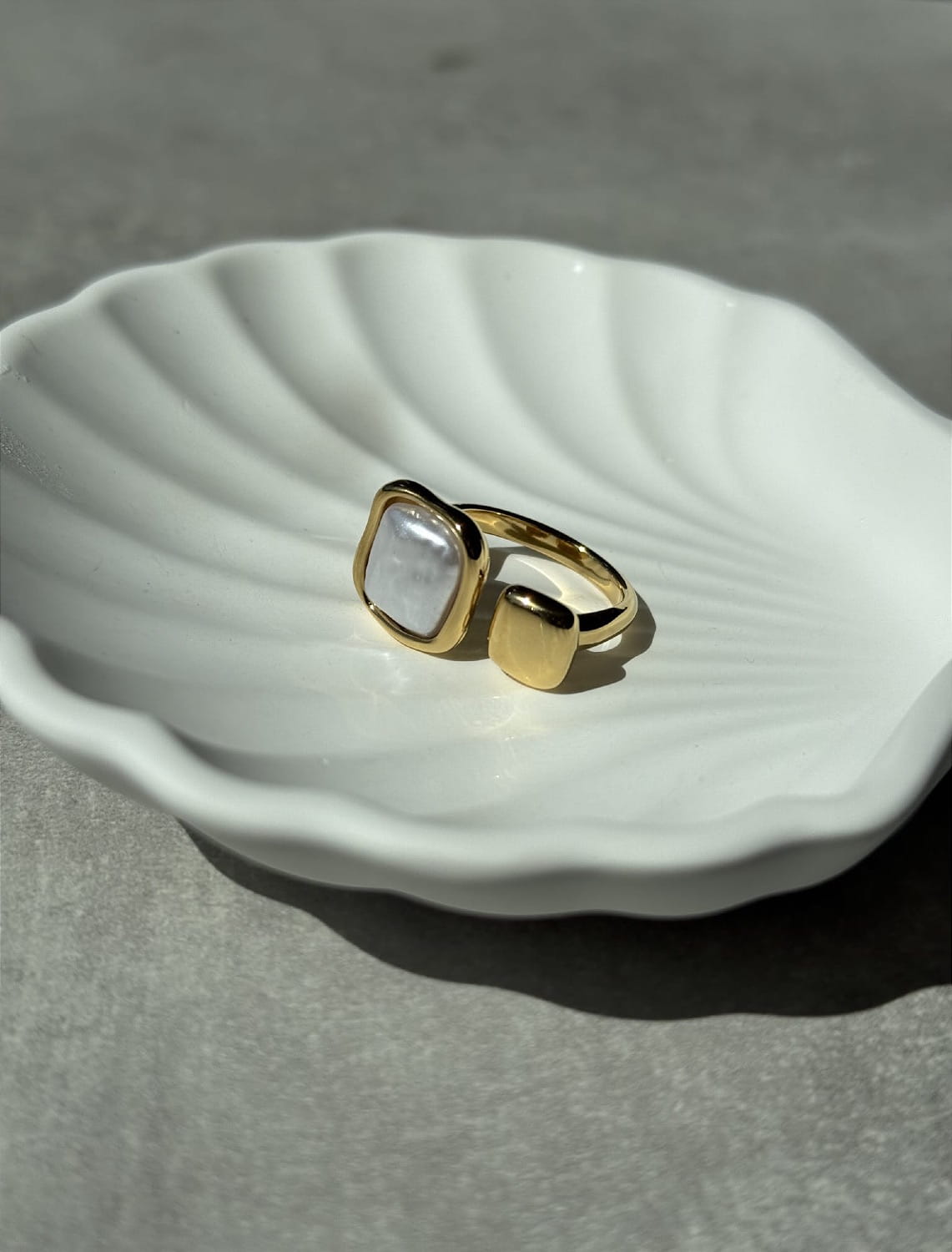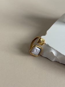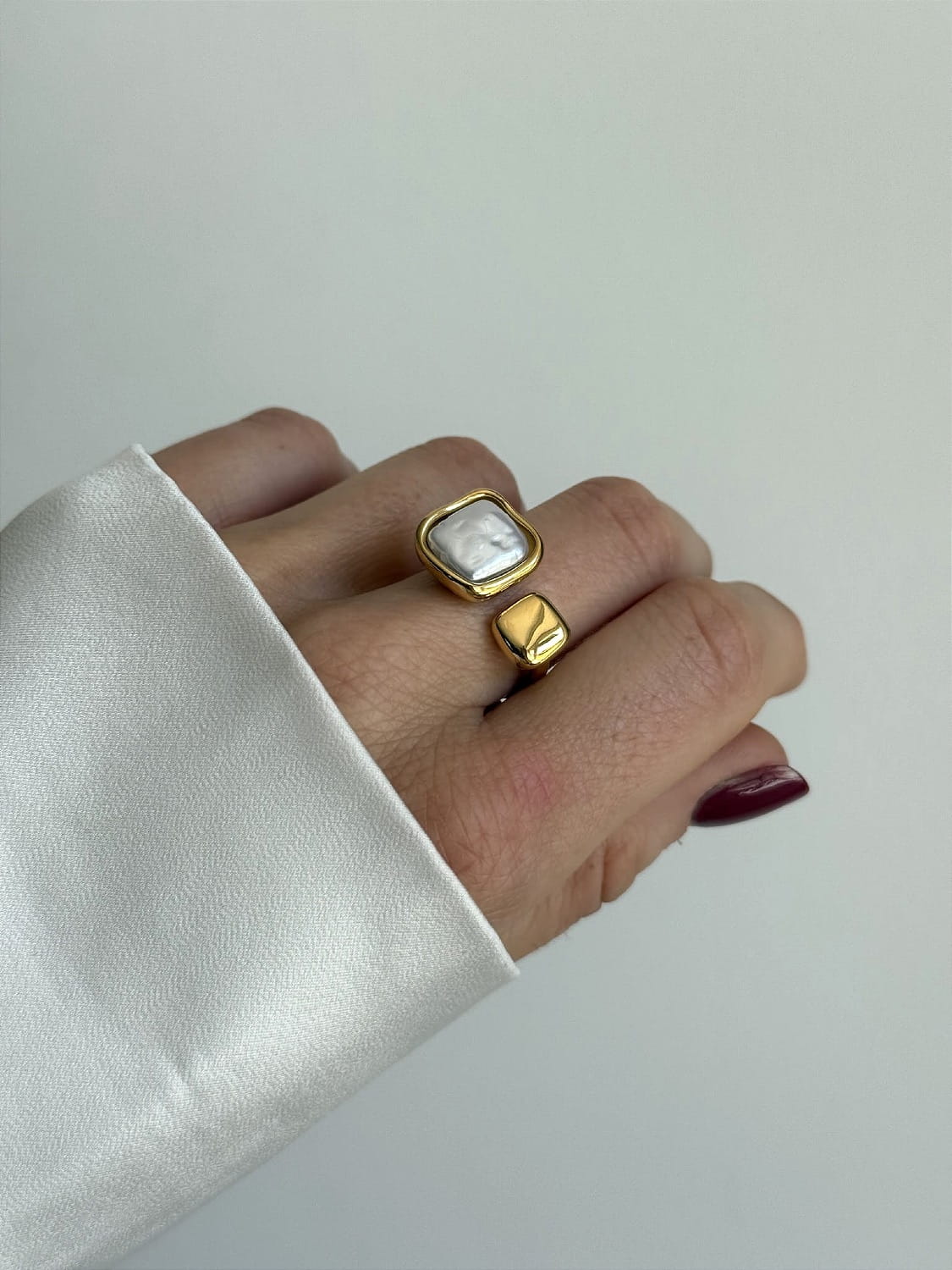 Unikatowy pierścionek o kwadratowych oczkach, z czego jedno wypełnione jest masą perłową